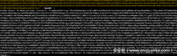 解码出来的字符串依然包含base64编码的字符串,但如果采用相同方式进行解码则会生成乱码。根据PowerShell命令中的IEX (New-Object IO.StreamReader(New-Object IO.Compression.GzipStream($s[IO.Compression.CompressionMode]::Decompress))).ReadToEnd()语句,我们可以知道这段字符串经过Gzip压缩处理过。