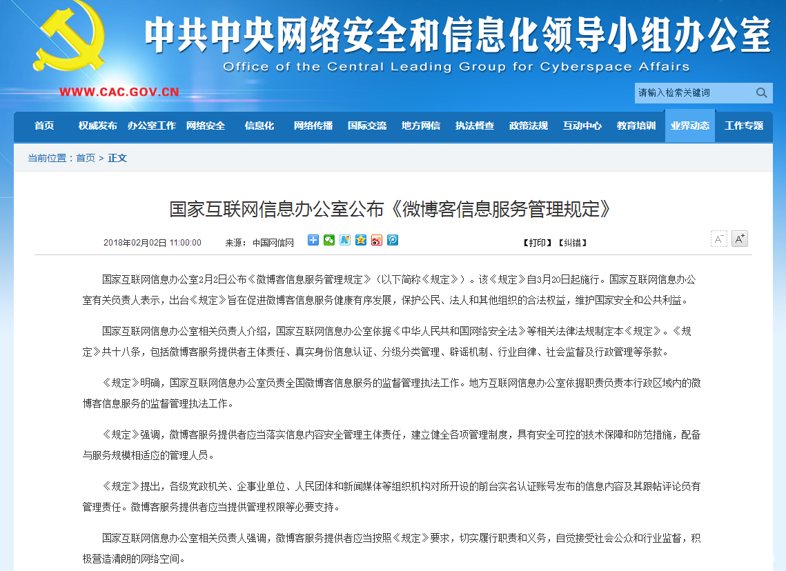 2018年1月份,北京网信办针对网络上存在的热搜榜、热门话题榜等的刷榜行为进行了统一治理。在对相关负责人进行了约谈后,于2月2号发布了《微博客信息服务管理规定》,开始对微博客信息服务进行更严格监督与管理。