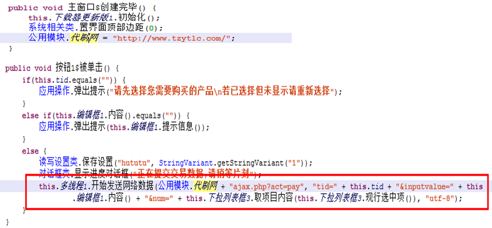 Android代刷软件只是一个下单平台,逻辑十分简单。以一款由E4A工具开发的代刷软件为例,其核心代码如下图所示。该代刷软件会根据用户在下单交互界面所选择的业务类型、商品类型、数量等构造请求参数串,并通过特定请求接口将请求参数串发送到代刷网站。