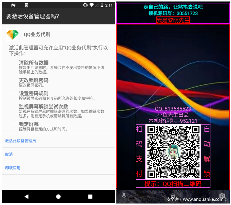 截止到2018年3月,360烽火实验室共捕获到超过20万个代刷软件,其中恶意勒索软件占比高达57.4%,这些软件打着代刷、代挂的幌子诱导用户下载、安装或激活设备管理器,随后对用户进行锁屏勒索,给用户设备与财产安全带来了严重威胁。
