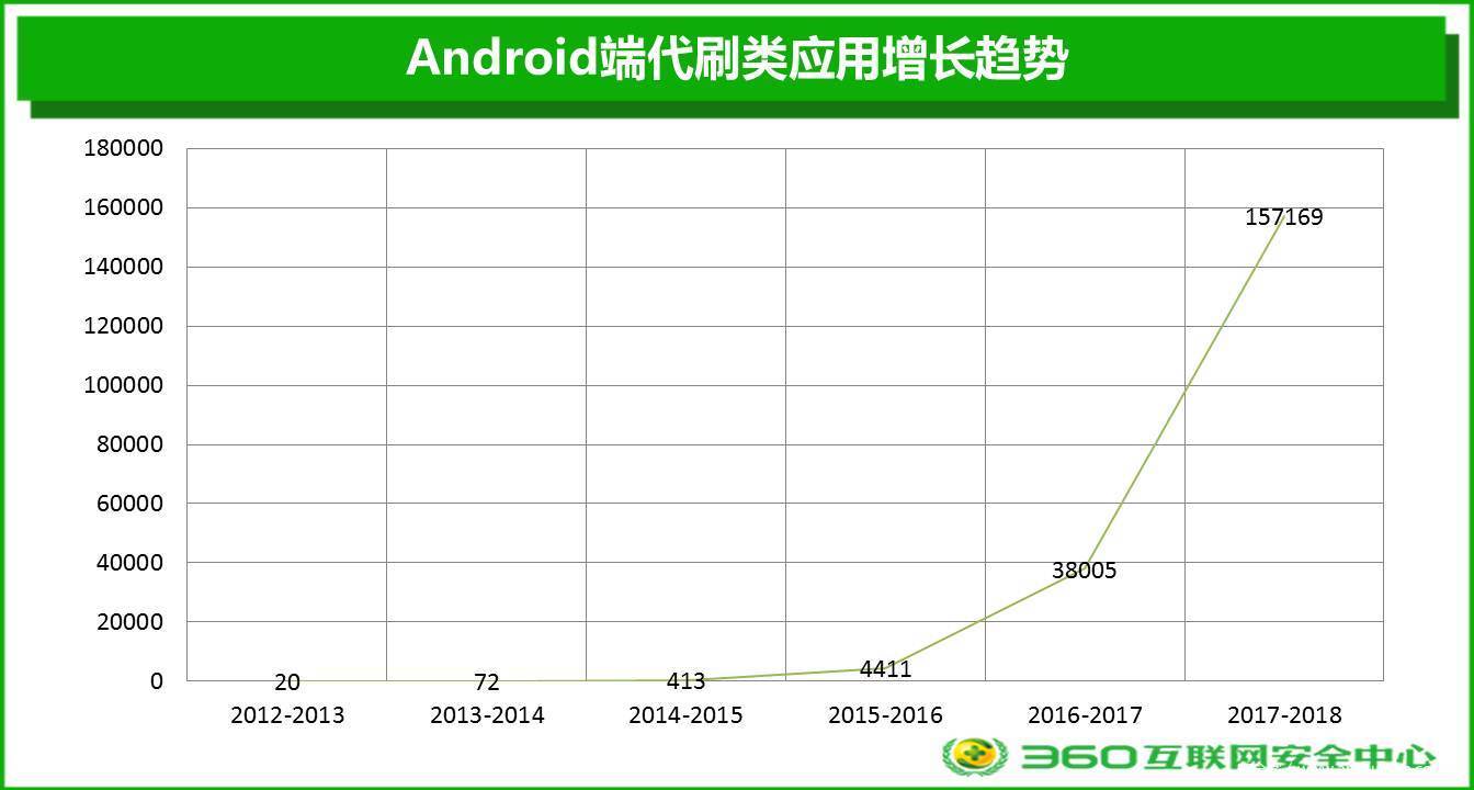 现今,移动互联网的发展势头正在渐渐超越传统互联网,面对移动互联网这块“肥肉”,代刷产业的步伐也没有停歇,代刷主战场已逐渐从Web平台转移到移动代刷软件。自2015年开始,Android代刷软件开始批量出现并逐渐增多,且近几年增长趋势逐年增强,仅2017年一年新增的代刷软件就超过了15万个,是2016年总量的3.1倍、2015年总量的35.6倍。