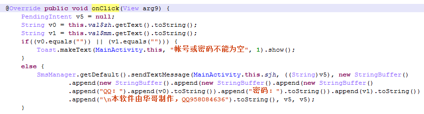盗窃账号、密码的行为多出现在由IAPP、AIDE等工具开发的恶意代刷软件中。这类软件最明显的特点就是在软件启动后出现账号、密码输入界面,并以代刷诱导用户输入账号与密码,一旦用户点击确认登录按钮,所输入的登录信息就会以短信或网络的方式被发送到指定手机或服务器上。这类软件属于欺诈盗号木马且实际上没有代刷功能,用户不但不能达到代刷的目的,反而会造成自己的账号密码被盗。