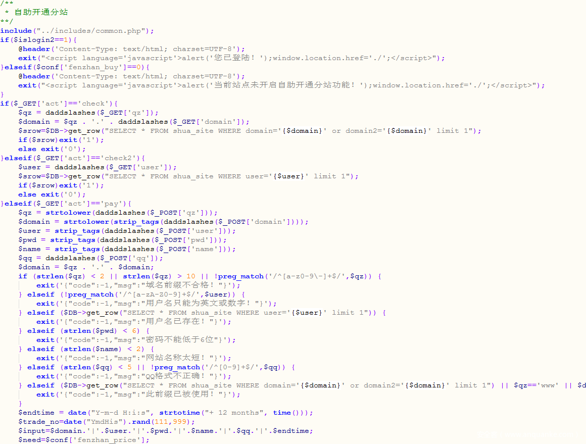 通过进一步分析从网络上随机取得的建站源码中包含的注册分站和获取QQ说说的代码,我们发现此源码结构及代码功能和这些代刷网站的源码与功能极其相似。由此基本可以判定市面上的代刷网站大部分都是使用的同一套建站源码。通过这套源码,建站者只需拥有自己的主机和域名就可以轻松建站,能力要求与成本极低。代刷产业正是凭借着低成本与门槛吸引了众多兼职人员加入其中。