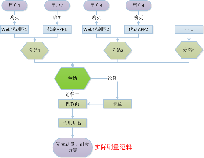 与免流产业一样,代刷产业也形成了由上至下、层层发散的产业链,从最上层供货商到中间的各类主站、分站再到最终消费的用户,各角色间既各司其职又有功能衔接与交叉,共同维系着整个代刷产业。