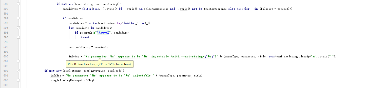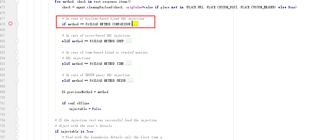 通过上图,通过sqlmap显示的info,找到关键词with --string=,来到sqlmap-masterlibcontrollerchecks.py,再寻找if、while之类的看下代码的流程,来到478行