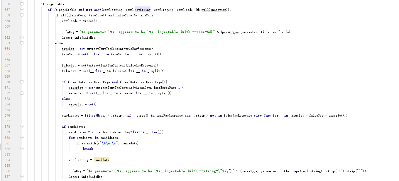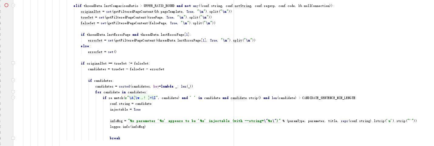 这里主要是用于在判断了可能存在注入,提取一些特征,比如返回状态码、返回字符串。函数extractTextTagContent通过正则<(abbr|acronym|b|blockquote|br|center|cite|code|dt|em|font|h\d|i|li|p|pre|q|strong|sub|sup|td|th|title|tt|u)(?!\w).*?>([^<]+)提取特定标签的text,然后获取正确页面text-错误页面text集合-错误页面的text,得到特征字符串。