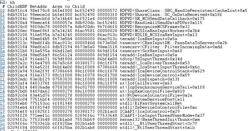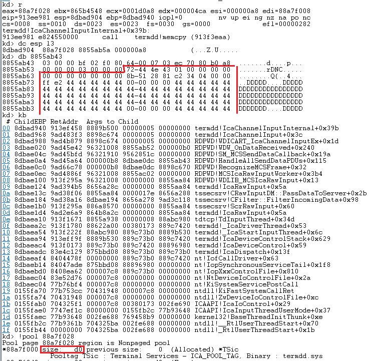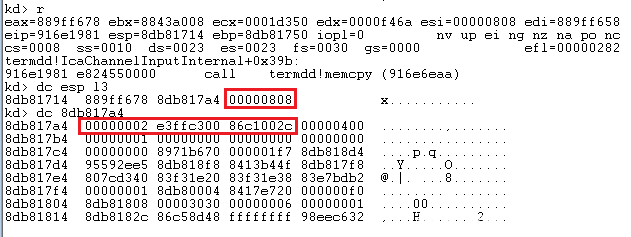 图20. 在windbg中观察termdd!IcaChannelInputInternal对应的memcpy操作