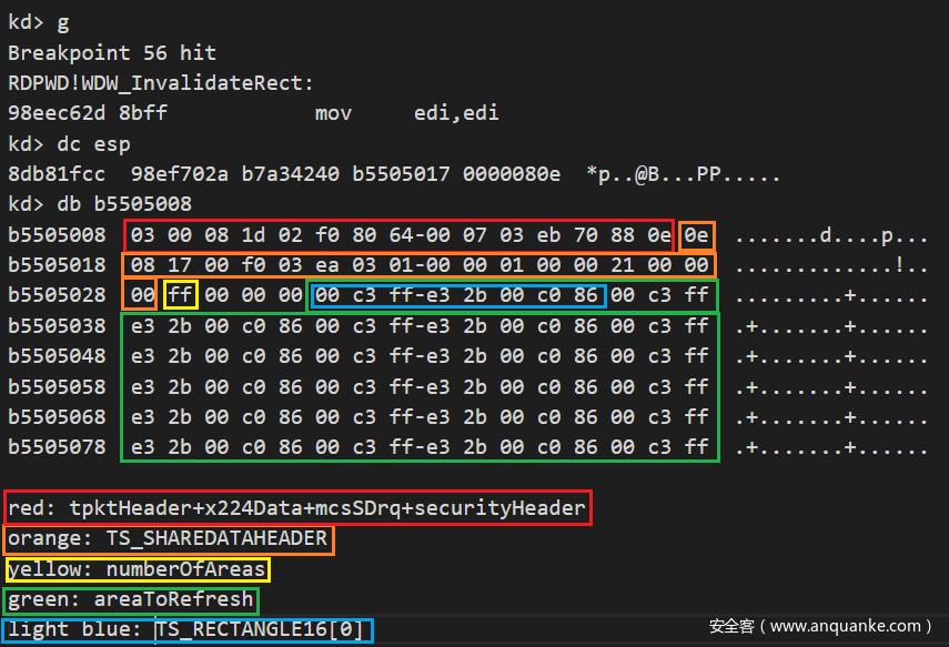 Refresh Rect PDU用来通知服务端一系列“Inclusive Rectangle”屏幕区域,以便服务端重绘会话屏幕区域中的一个或多个矩形区域。这个PDU基于默认打开的一个信道进行传输,信道ID为0x03ea(Server Channel ID)。当连接时序完成后,如图1所示,RDP服务端就可以接收/解析Refresh Rect PDU,并且这里最重要的一点在于Refresh Rect PDU可以多次发送。虽然TS_RECTANGLE16大小只有8字节,这意味着RDP客户端只能控制8字节数据,但这依然可以作为将数据写入内核的一个切入点。