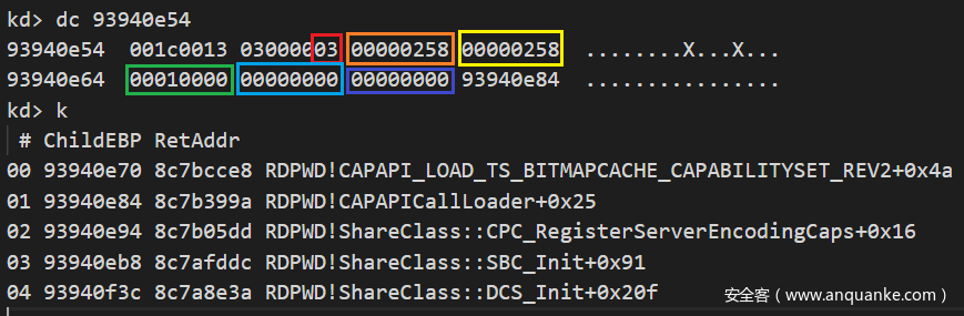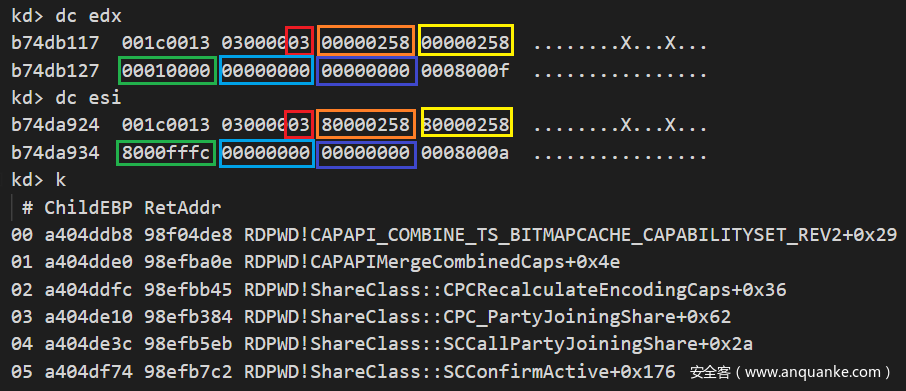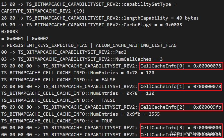 CAPAPI_COMBINE_TS_BITMAPCACHE_CAPABILITYSET_REV2会将服务端初始化的NumCellCaches(0x03)及totalEntriesCacheLimit[0-4](0x258、0x258、0x10000、0x0及0x0,如图9中edx寄存器所示)与客户端请求中的NumCellCaches(0x03)及totalEntriesCache[0-4](0x80000258、0x80000258、0x8000fffc、0x0及0x0,如图9中esi寄存器所示)组合起来。客户端可以控制NumCellCaches及totalEntriesCache[0-4],如图10所示,但不能超过服务端初始化的NumCellCaches(0x03)及totalEntriesCacheLimit[0-4](0x258、0x258、0x10000、0x0及0x0),如图11随时。