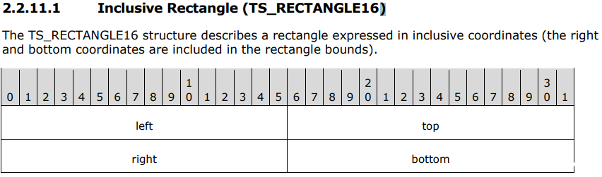numberOfAreas字段是一个8比特无符号整数,用来定义areasToRefresh字段中Inclusive Rectangle结构的数量。areaToRefresh是包含TS_RECTANGLE16结构的一个数组,如图15所示。