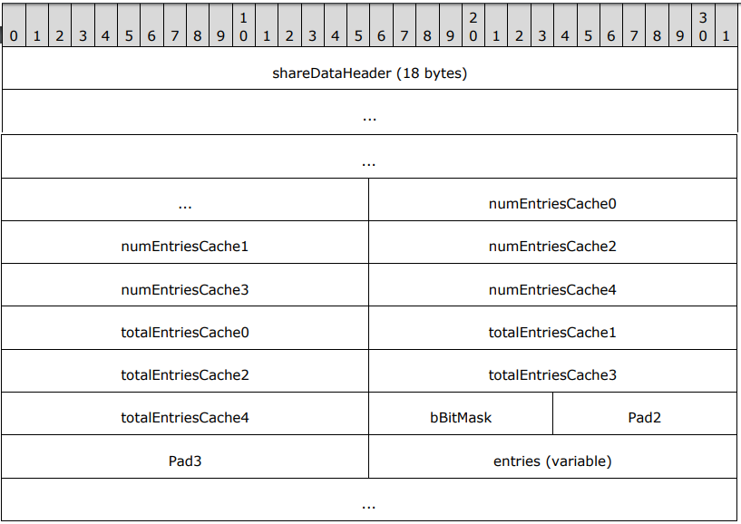 numEntriesCacheX(X取0到4之间的值)以及totalEntriesCacheX(X取0到4之间的值)字段所控制,这两个字段大小均为2字节(WORD); - Bitmap Cache PDU可以被多次发送,因为bitmap key可以通过多个Persistent Key List PDU发送,每个PDU通过