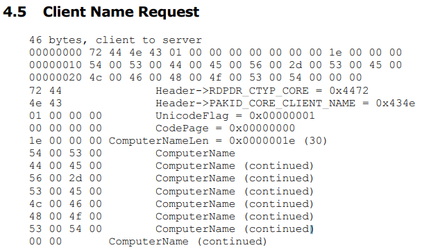 根据MS-RDPEFS文档描述,RDPDR Client Name Request PDU在“Remote Desktop Protocol: File System Virtual Channel Extension”(文件系统虚拟信道扩展)中指定,该扩展运行在名为RDPDR的静态虚拟信道(static virtual channel)中。MS-RDPEFS协议的目的是将访问流从服务端重定向到客户端文件系统。Client Name Request是客户端发往服务端的第二个PDU,如图24所示。