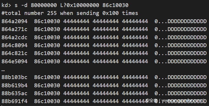 根据这些信息,当RDP客户端向服务端发送一个Refresh Rect PDU,且numberOfAreas字段值为0xFF时,RDP服务端就会调用termdd!IcaChannelInputInternal 0xFF次。每次termdd!IcaChannelInputInternal调用都会分配0x828大小的内核池内存空间,将客户端可控的8字节TS_RECTANGLE16拷贝到该内核池中。因此,numberOfAreas字段值为0xFF的1个Refresh Rect PDU就可以分配0xFF个大小为0x828字节的内核池。从理论上讲,如果RDP客户端发送0x200次Refresh Rect PDU,那么RDP服务端就会分配大约0x20000个大小为0x828的非分页内核池。考虑到0x828大小的内核池会按照0x1000进行对齐,因此会同时占据非常大范围的内核池,客户端可控的8字节数据会被复制到每个0x1000内核池中0x02c固定偏移处。如图22所示,我们可以通过Refresh Rect PDU在内核中构建非常稳定的池喷射。