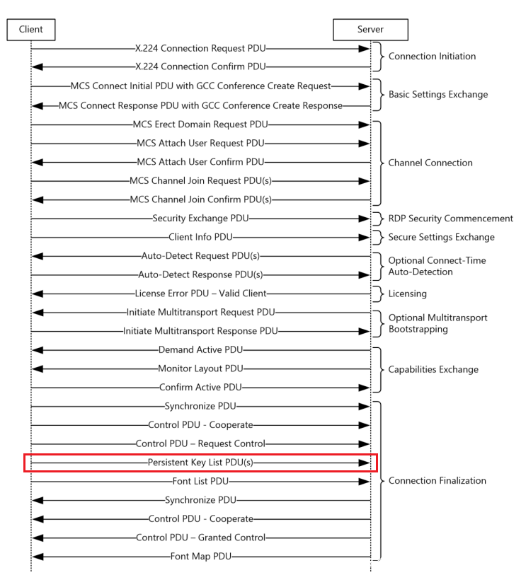 根据MS-RDPBCGR(Remote Desktop Protocol: Basic Connectivity and Graphics Remoting)文档描述,Bitmap Cache PDU的全称为TS_BITMAPCACHE_PERSISTENT_LIST_PDU,这是一种Persistent Key List PDU Data,内嵌在Persistent Key List PDU中。Persistent Key List PDU是一种RDP Connection Sequence(连接时序)PDU,在RDP Connection Sequence的Connection Finalization(连接完成)阶段由客户端发送至服务端,如图1所示。