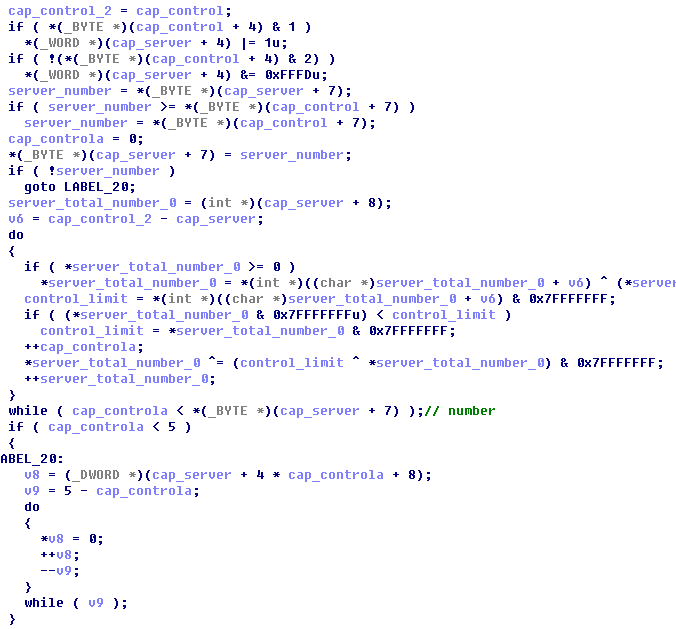 如图4所示,bitmapCacheListPoolLen = 0xC * (total length + 4),而total length = totalEntriesCache0 + totalEntriesCache1 + totalEntriesCache2 + totalEntriesCache3 + totalEntriesCache4。根据这个公式,我们可以设置totalEntriesCacheX=0xffff,这样bitmapCacheListPoolLen就能取得最大值。然而如图8所示,系统会对每个totalEntriesCacheX检查totalEntriesCacheLimit。totalEntriesCacheLimitX来自于TS_BITMAPCACHE_CAPABILITYSET_REV2结构体,当RDPWD调用DCS_Init时,CAPAPI_LOAD_TS_BITMAPCACHE_CAPABILITYSET_REV2函数就会初始化这个结构体。当解析Confirm Active PDU时,CAPAPI_COMBINE_TS_BITMAPCACHE_CAPABILITYSET_REV2函数就会将这些值组合起来,如图9所示。