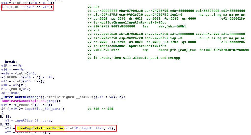 在某些情况下,当termdd!_IcaQueueReadChannelRequest修改某个指针时(图23中的v14变量),判断条件为False,此时ExAllocatePoolWithTag以及memcpy并不会被调用,代码也不会进入_IcaCopyDataToUserBuffer分支,这样将导致池无法成功分配。然而,当多次发送Refresh Rect PDU时,尽管某些池无法成功分配,我们还是可以成功形成内核池喷射。