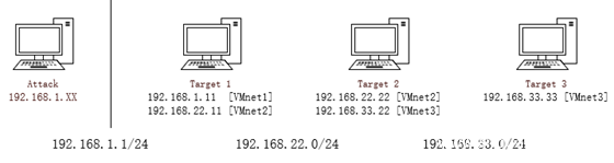 简单对主机搭建的环境画了个网络拓扑,攻击机的网段在192.168.1.1/24,三台靶机的IP地址分别如图 1所示。 图 1
