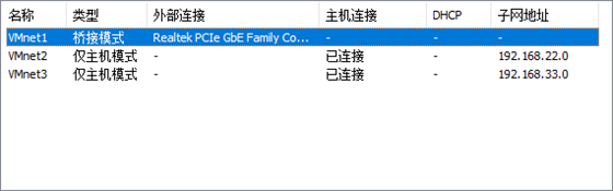 Vmware的3个网卡分别配置为桥接,仅主机和仅主机,具体子网地址如图 2所示。 图 2
