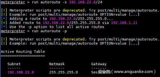 run autoroute -s 192.168.22.0/24