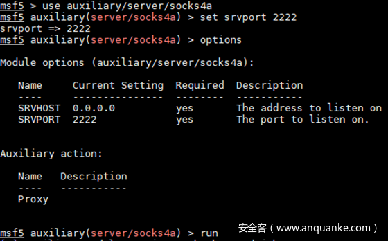 msf5 auxiliary(server/socks4a) > set srvport 2222