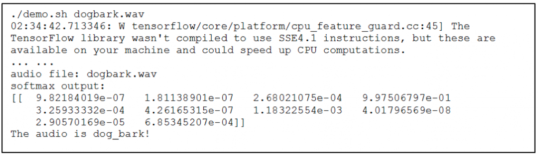 如对于这个模型 , 当给定一个正常的狗叫的音频文件,应用可以识别声音内容为 “dog bark”,其过程如下: