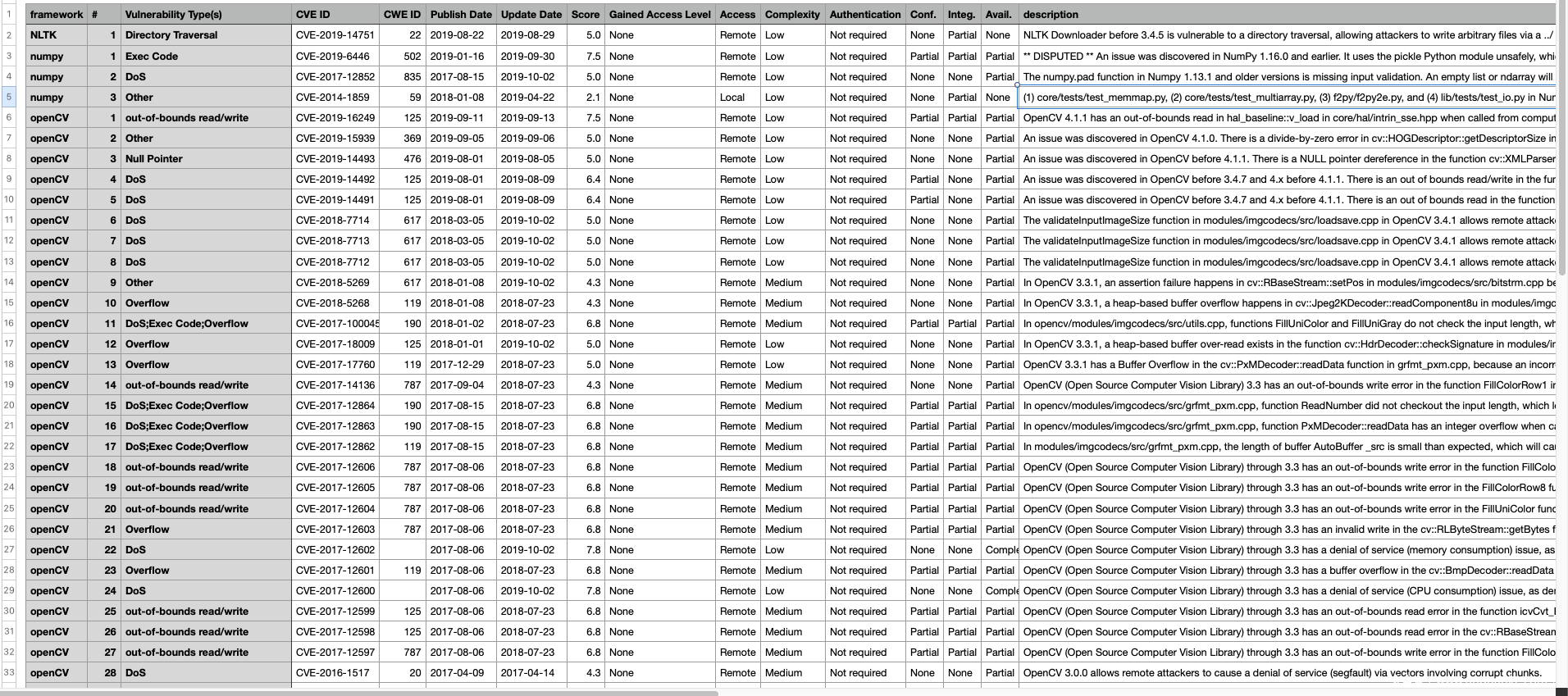 考虑到最便捷的数据集获取方式,我们考虑使用cvedetail对 TOP10 机器学习框架、第三方包的cve数据进行收集。若该库未被cvedetail收纳,则不计入本次分析。