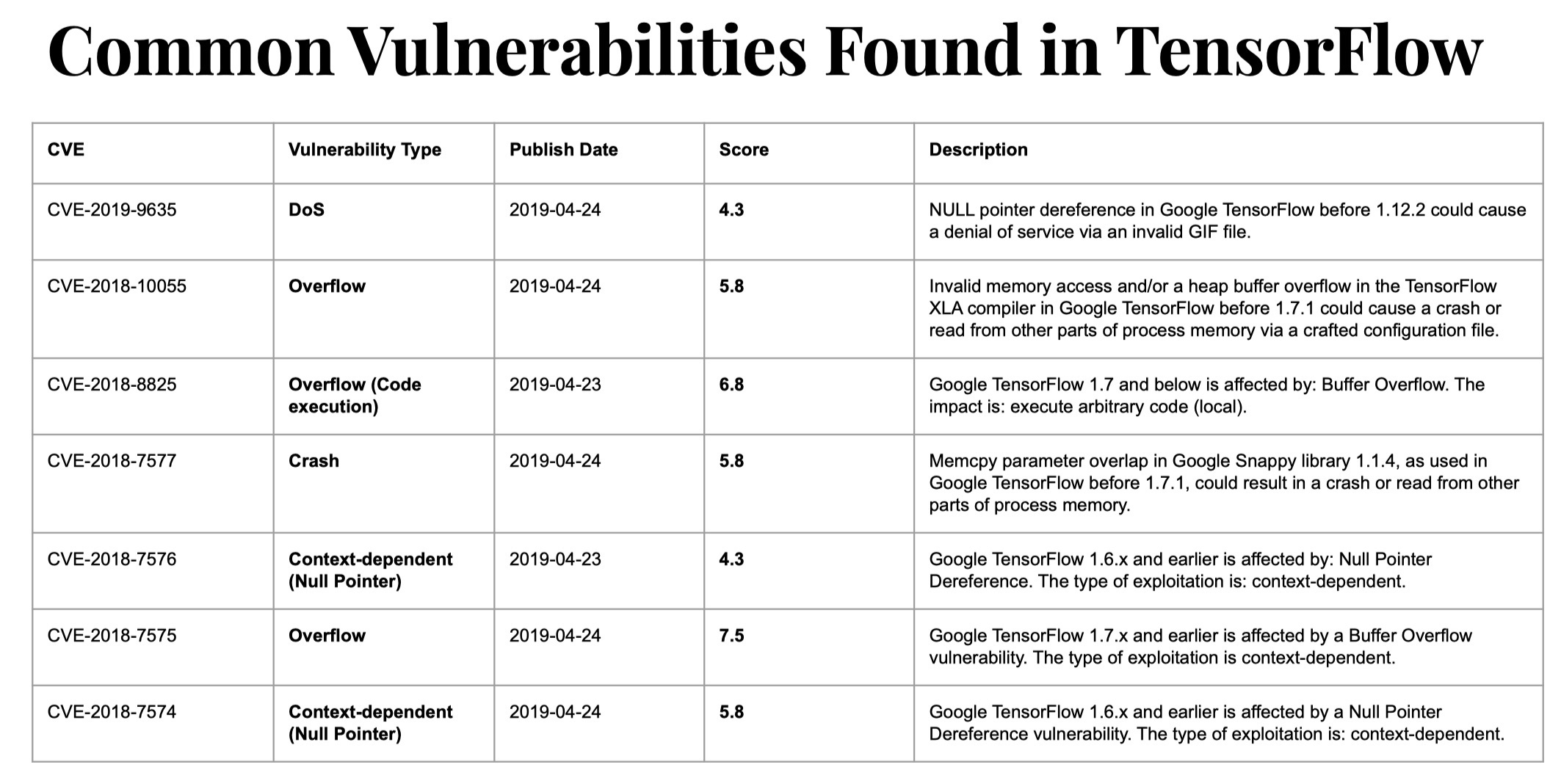 此外,算法模型和框架还强依赖于大量三方包,如numpy、pandas、计算机视觉常用的openCV、自然语言处理常用的NLTK等等。因此,一旦这些深度学习框架和三方包中存在漏洞,就会被引入模型,破坏模型的可用性。