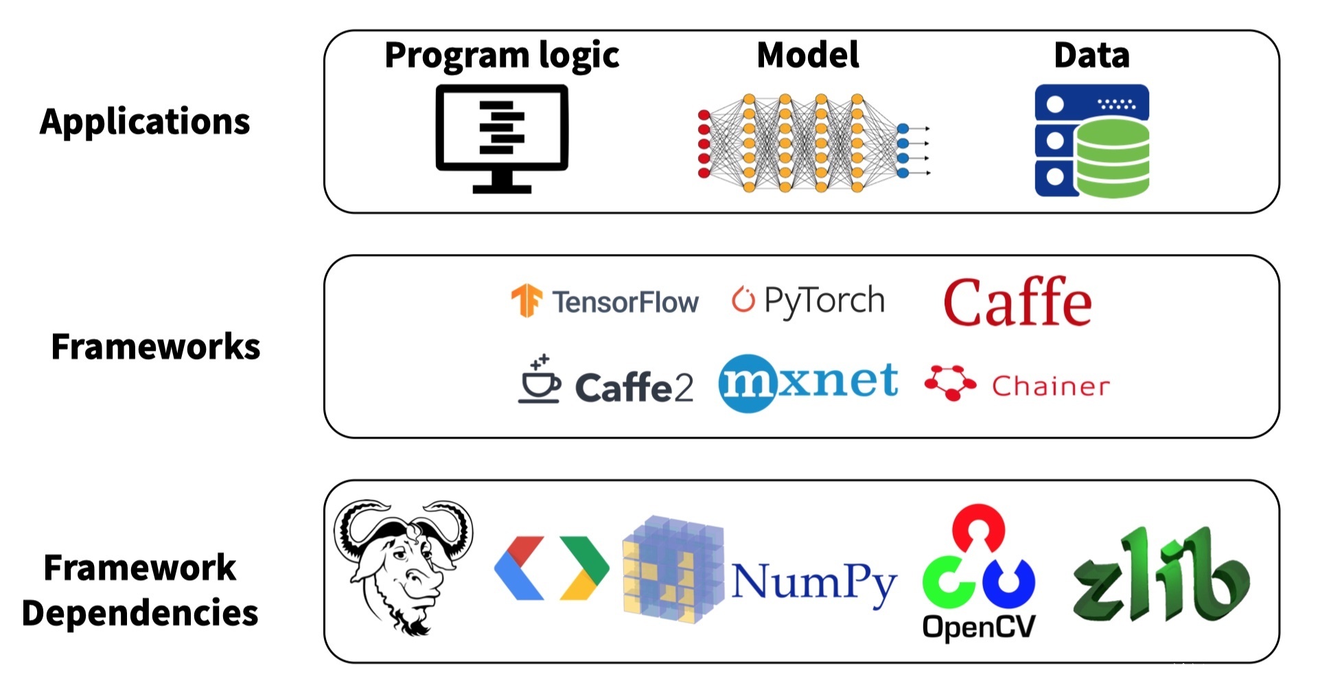 众所周知,当前运行的大多机器学习模型或是深度学习模型,都是基于一些底层的机器学习/深度学习框架和三方包。尤其是深度学习模型,系统框架非常多,主流的包括Tensorflow、Torch、Caffe等。通过使用深度学习框架,算法人员可以无需关心神经网络和训练过程的实现细节,更多关注应用本身的业务逻辑。 开发人员可以在框架上直接构建自己的模型,并利用框架提供的接口对模型进行训练。这些框架简化了深度学习应用的设计和开发难度,甚至仅通过几十行代码就能将一个深度学习模型构建出来。