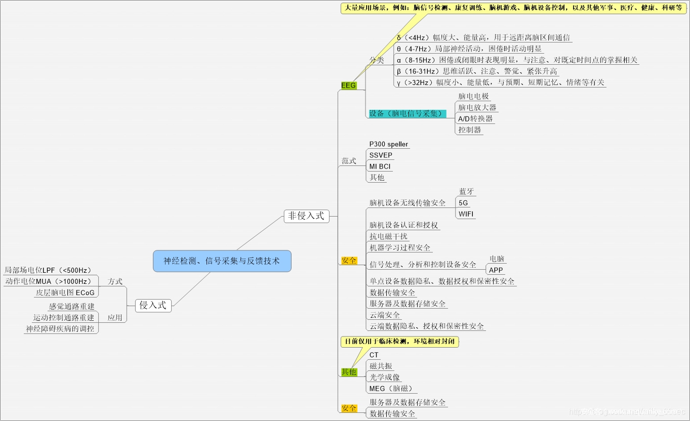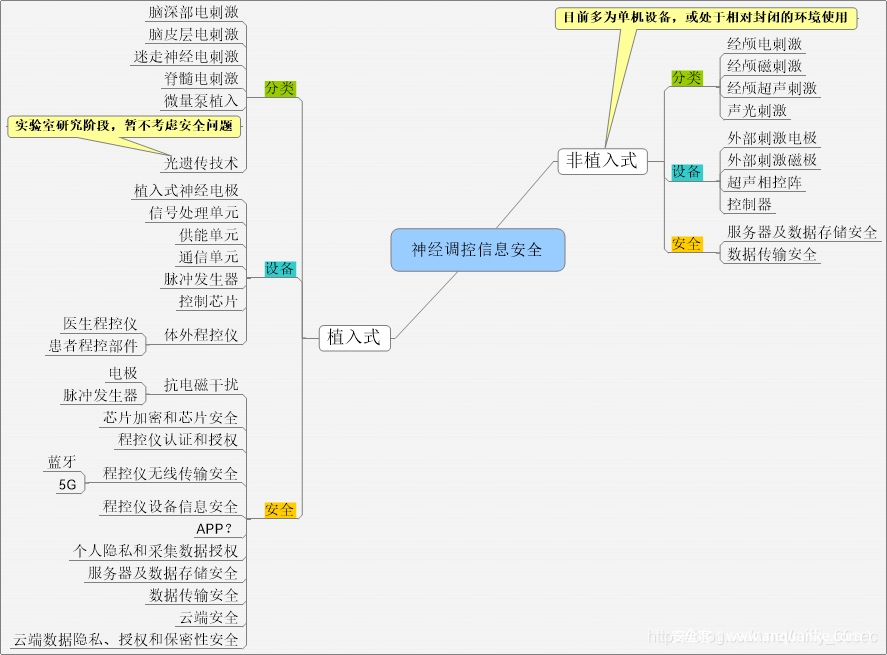 我们期待着神经工程学和脑机接口技术的高速发展,同时也希望它们能健康和安全,不会因为信息安全问题受阻。所以零零实验室(00SEC)开始了对于该领域的信息安全研究工作。我们是传统信息安全领域的攻防专家,但在进行神经工程学信息安全研究时发现,目前无论国内外,都没有一个相对完整的研究方向全景图,这曾经给我们带来了一些困扰。我们尝试着将该领域按照信息安全关注点进行分类,现在将分类导图进行分享,以供更多的白帽子们能够更快速的切入研究主题。