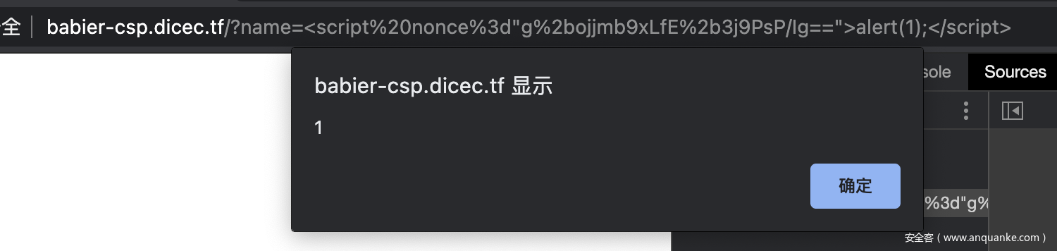 成功触发弹窗,虽然测试成功了,但是我们仍然还要注意到题目还有 CSP 的存在…