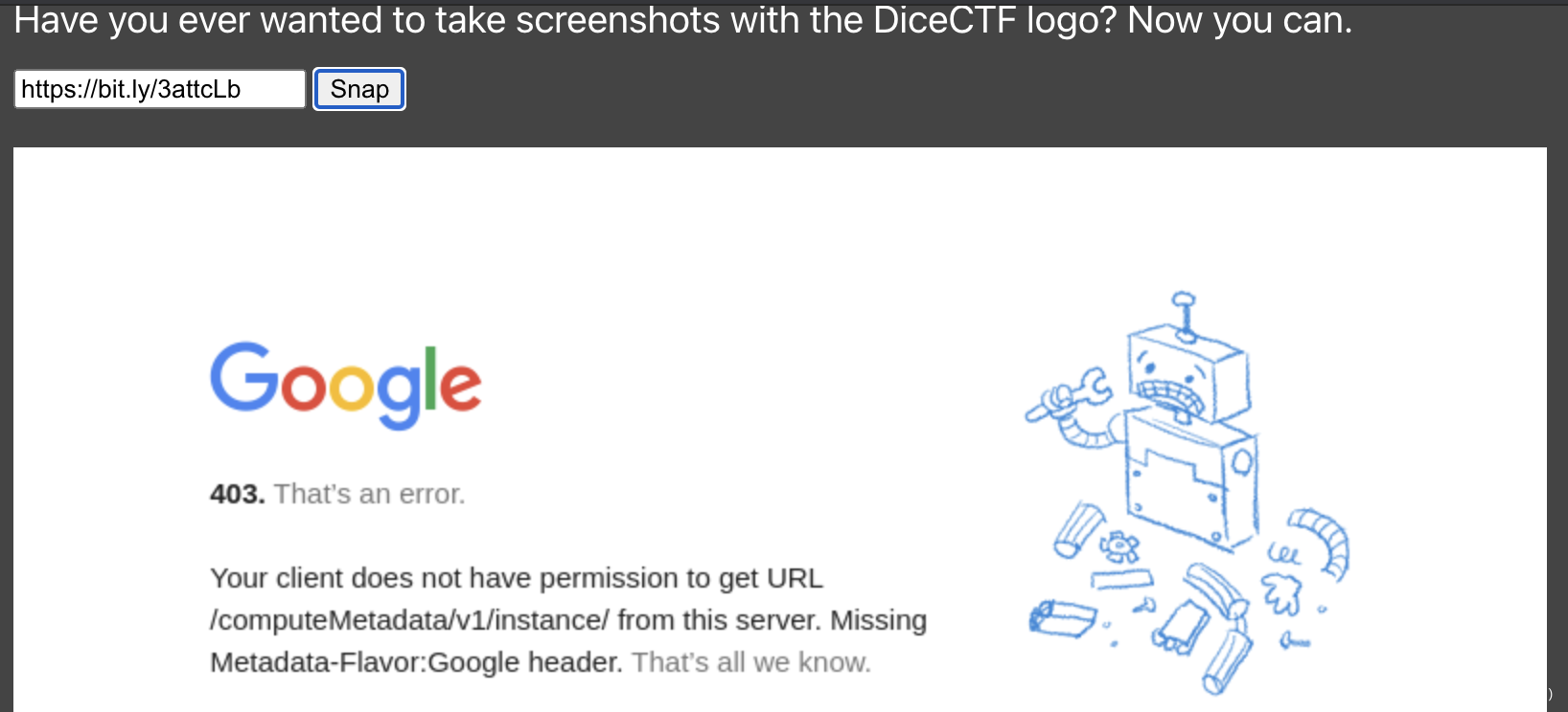 题目意图比较明显,就是需要让我们通过 SSRF 获取 Google Cloud 相关的信息,前面的过滤措施也不是什么新的考点,我们可以通过查找一些 SSRF 绕过姿势找到 302 跳转的绕过形式,我们可以使用 bit.ly 提供的短链接服务方便地构造我们的跳转地址,例如我们先按照老规矩,先看看 http://metadata.google.internal/computeMetadata/v1/instance/ 能不能成功