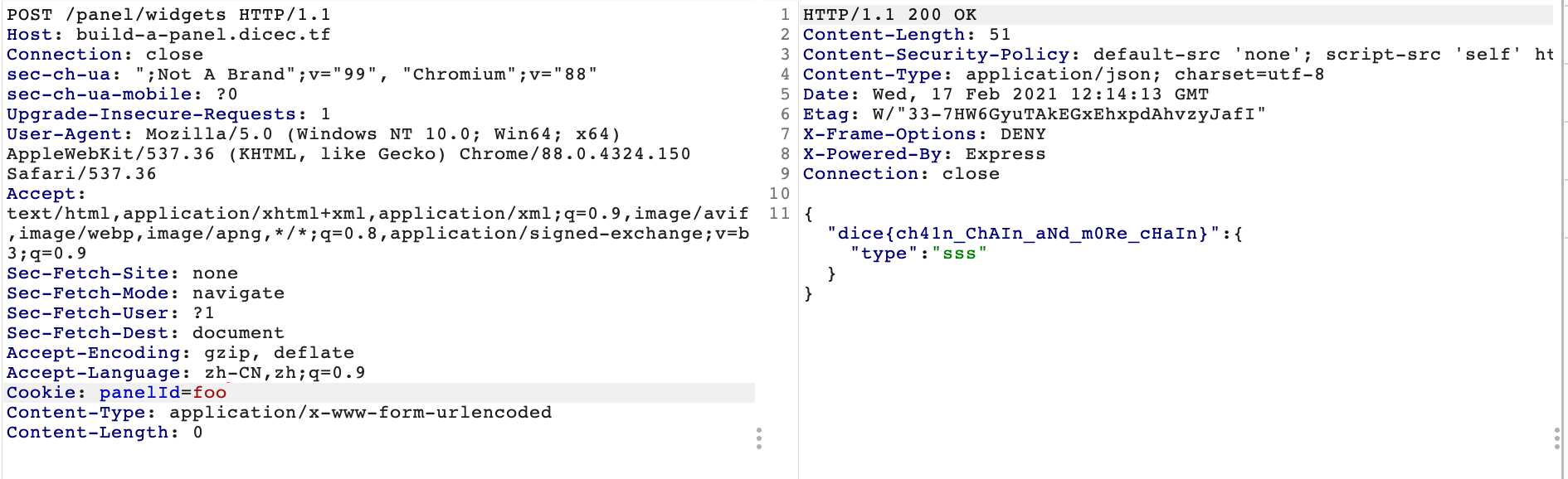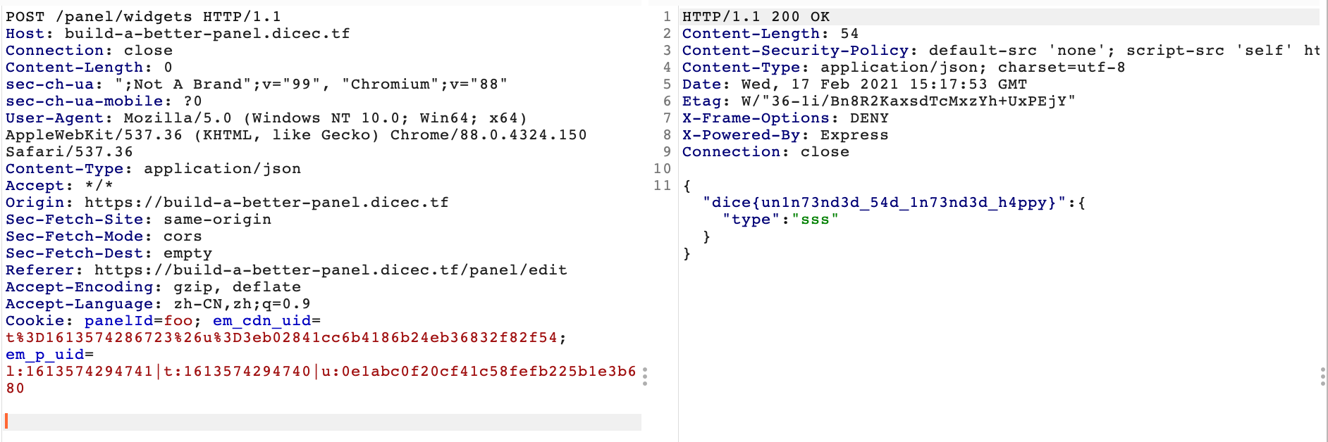 把上述 json 通过 /panel/add 增加到对应 panelId 内容中,然后把 panelId 对应的 URL 发给 admin ,然后到 /panel/widgets 路由带着 cookie 访问即可拿到 flag