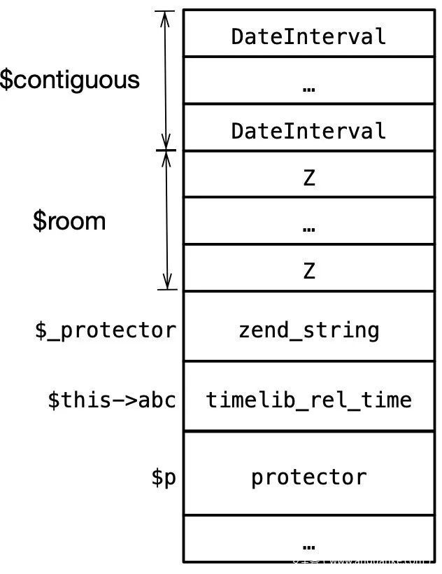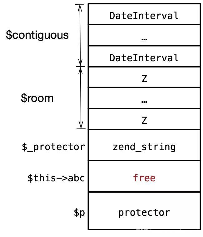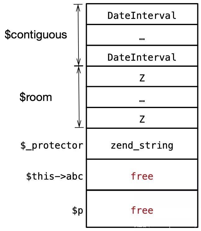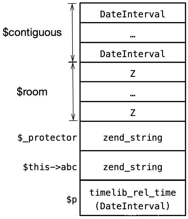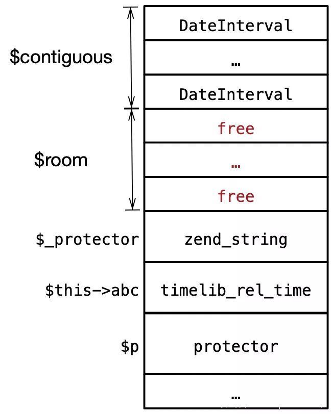 在脚本运行之前可能发生了大量的分配/释放,因此同时实例化的两个变量也不一定是连续的,为解决这个问题,实例化几个DateInterval对象填充不连续空闲块,以确保后面分配的内存是连续的: