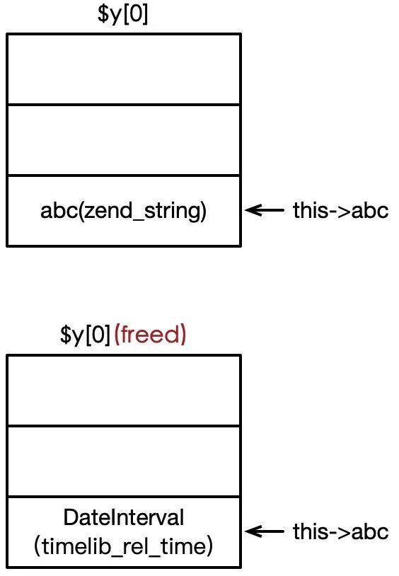 - 然后再请求分配一个和刚才释放大小相同的内存块,这里使用的是DateInterval(PHP的对象内部实现往往由几个结构体组成,这里其实是DateInterval中的timelib_rel_time和zend_string大小相同),于是DateInterval就占据了原来字符串的位置,如下图所示: