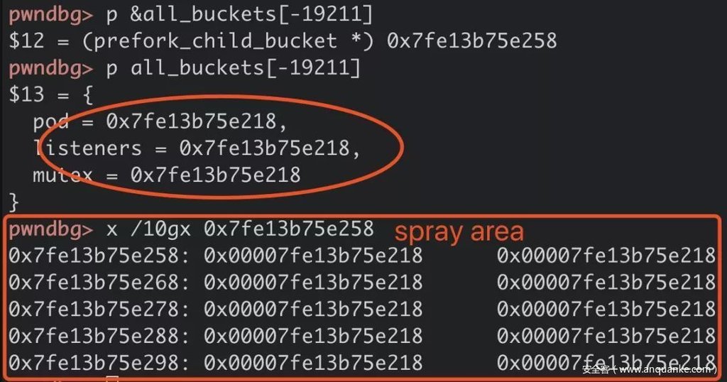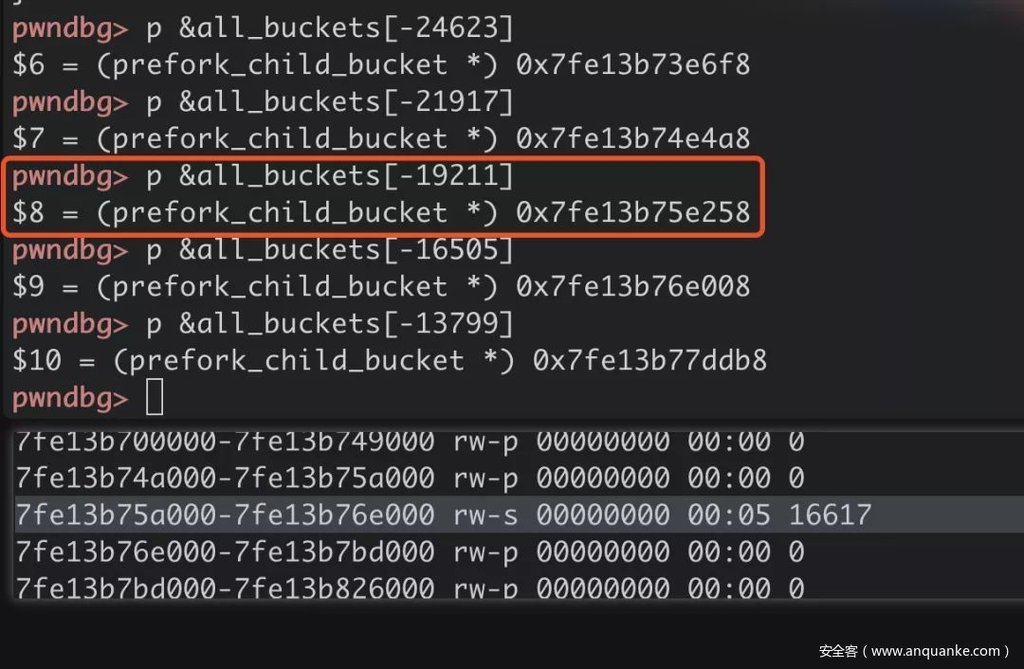 如果我们在共享内存中伪造一个prefork_child_bucket结构(即all_buckets数组的元素),并修改all_buckets数组的索引bucket,就可以在第三行处的代码控制my_bucket指向该结构。