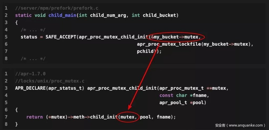 进而在后续代码执行my_bucket->mutex->meth->child_init(mutex, pool, fname),meth结构包含指向多个函数的指针,因此,将其中的child_init函数的指针覆盖为我们想要执行函数的指针,就可以达到漏洞利用的目的,并且此时进程还是处于root权限的,后面才降低自身的权限。