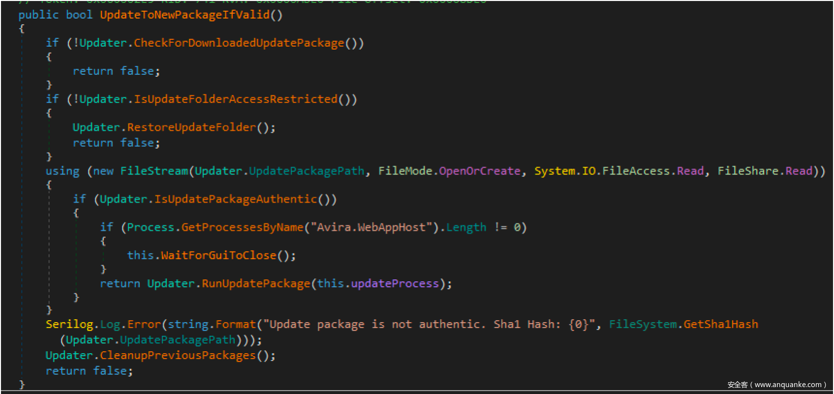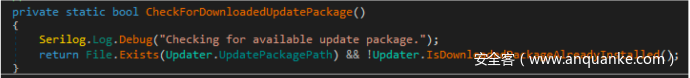 一旦进入Updater.UpdateToNewPackageifValid()代码分支,该服务首先会调用Updater.CheckForDownloadedUpdatePackage(),检查本机中是否已下载更新文件。更具体一些,服务会检查磁盘上是否存在C:\ProgramData\Avira\VPN\Update\AviraVPNInstaller.exe,判断该更新文件是否已安装: