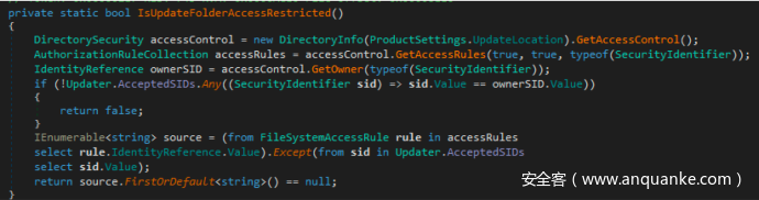 验证C:\ProgramData\Avira\VPN\Update\AviraVPNInstaller.exe存在且尚未安装后,该服务会调用Updater.IsUpdateFolderAccessRestricted()。该函数的功能似乎是确保C:\ProgramData\Avira\VPN\Update处于锁定状态,并且不能被低权限用户写入(以便在执行更新操作前保护更新程序)。服务首先会检查该目录是否隶属于NT AUTHORITY\SYSTEM、NT AUTHORITY\SERVICE或者Administrators用户(相应值存储在AcceptedSIDs属性中):