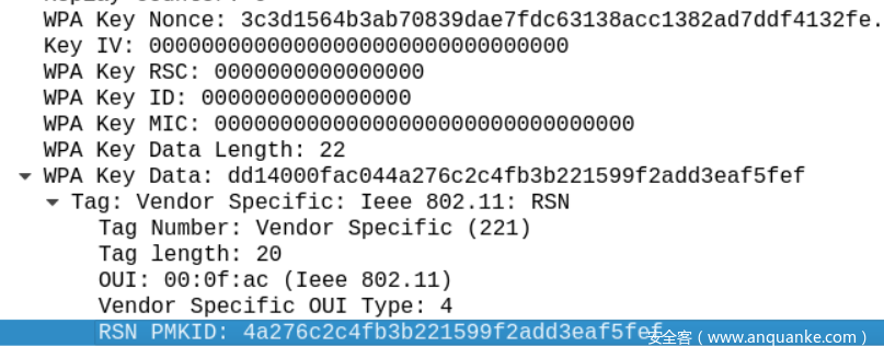 这是2018年由Hashcat的作者发现的一种新型攻击方法. 与现有攻击的主要区别在于此攻击不需要捕获完整的EAPOL 4 向握手. 攻击者和客户端之间没有任何交互, 当有客户端进行连接时, 许多WIFI路由器会在AP自身发送的第一个EAPOL帧的末尾附加一个可选字段, 其中包括 RSN – PMKID数据包. 由于PMK名称字符串是不变的,同时我们知道AP和客户端的MAC, 所以我们也就掌握了破解 PSK 的所需信息.