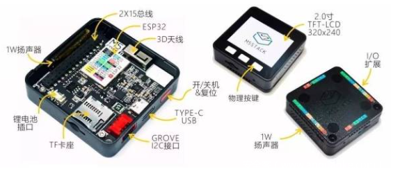 其核心为 ESP32(240 MHz 双核 Tensilica LX6 处理器, 运算能力高达 600 DMIPS. 具备 Wi-Fi/BLE 功能, 内部集成了 2.0 寸 LCD、1W 扬声器、TF 读卡器、Grove 接口、高性能的 3D 天线, 底部模块集成 150 mah 锂电池等.