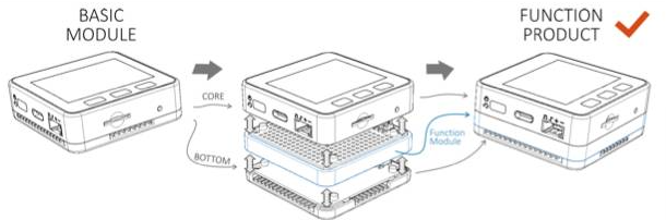 通过模块组合M5可实现各种功能, 不同模块之间可以像乐高积木一样层叠拼插,拼接之后的模块可以组成一个完整而牢固的整体. M5的模块家族大量实现具体功能的传感器、通信、驱动、扩展等模块.