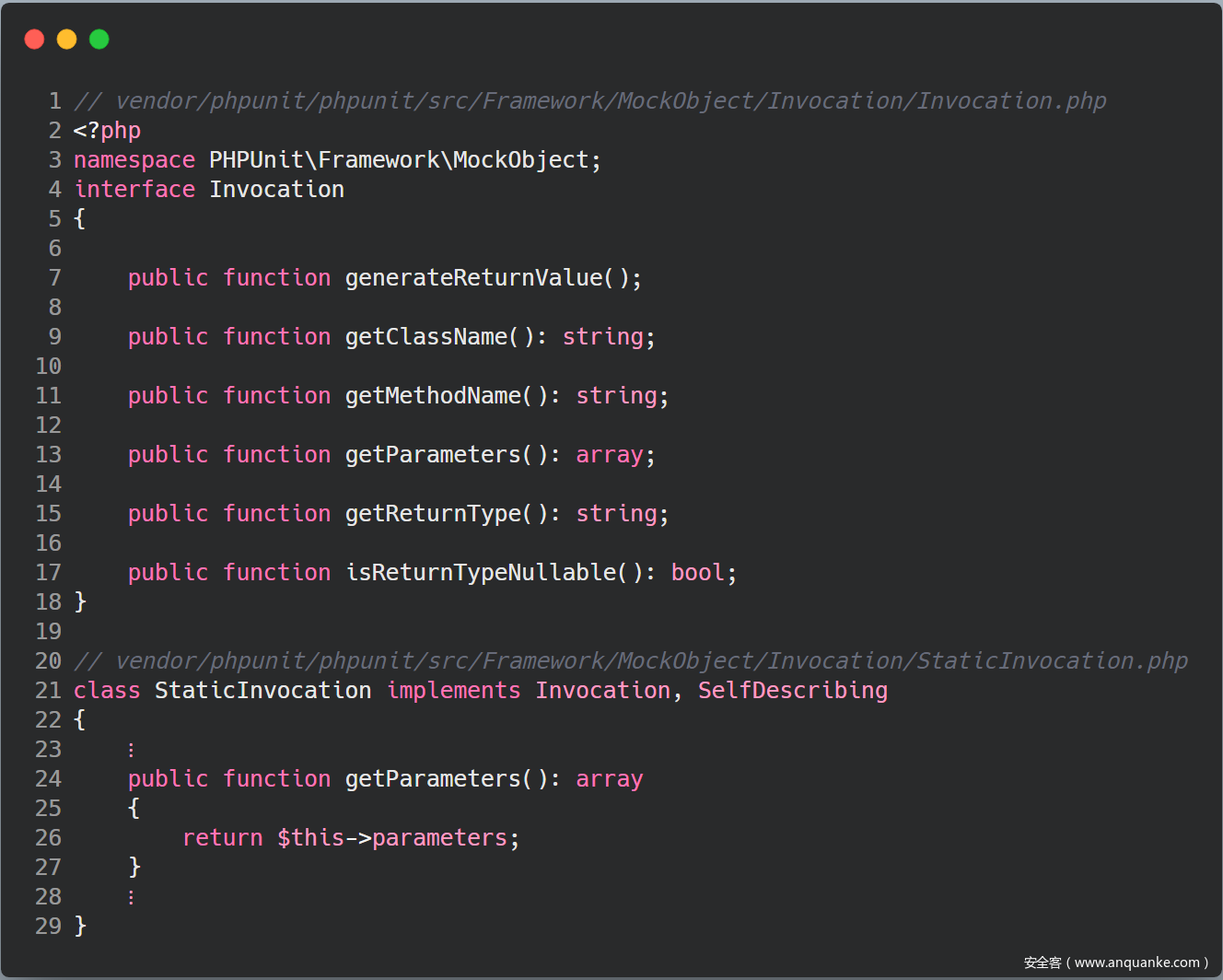很明显 invoke 方法两个参数都可控,现在我们只要构造好一个 Invocation 类对象即可。通过搜索,我们会发现 Invocation 是一个接口,那么我们找到他的实现类即可。这里我找到了 StaticInvocation 类来实现上诉功能,其代码具体如下: