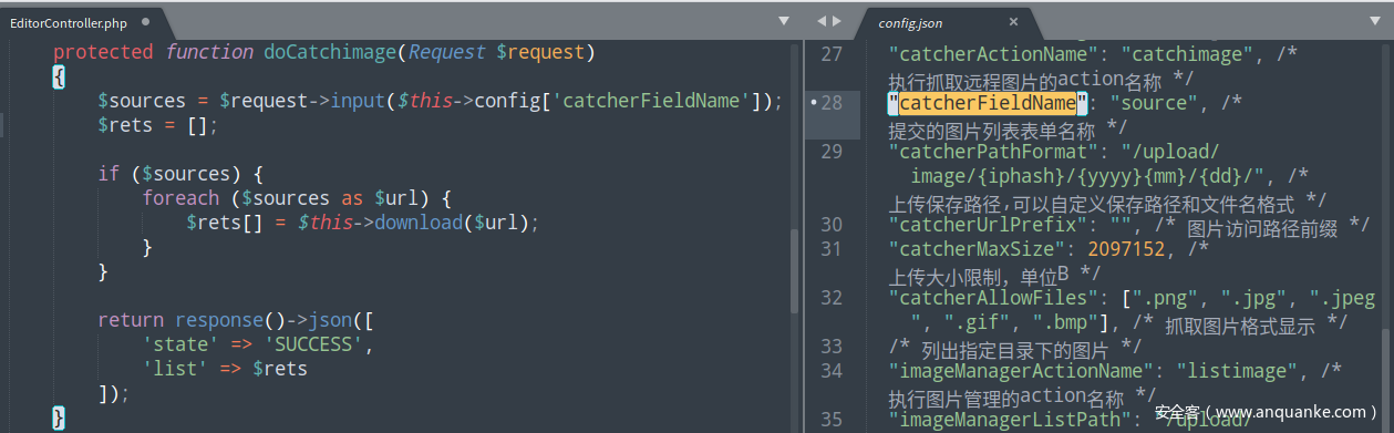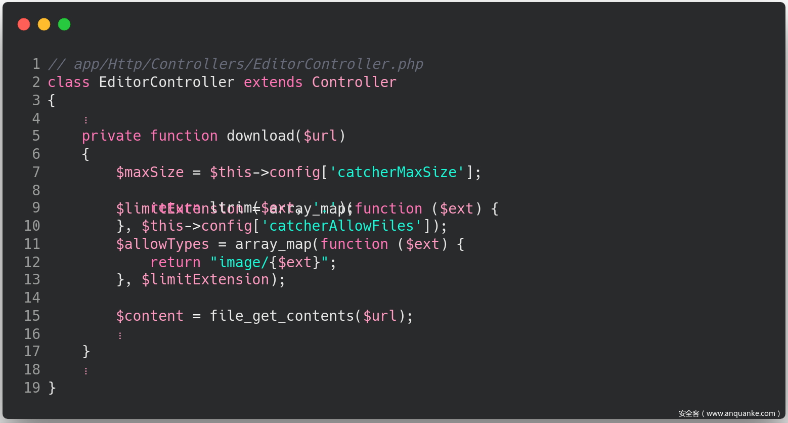 我们进而看 app/Http/Controllers/EditorController.php 文件,很快便会发现有一个 download 方法中的 $url 变量没有经过任何处理用在了 file_get_contents 函数中, download 方法代码如下: